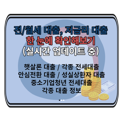전/월세 대출, 주택담보대출을 처음 받거나 저금리 대출 정보를 알고 싶지만 범람하는 정보 때문에 오히려 머리가 아프셨던 분들 많으실 겁니다. 각종 대출 종류와 대출 정보를 한눈에 확인해보실 수 있도록 수십, 수백만 원의 가치를 쉽게 정리해 두었으니, 1분만 집중하셔서 필요한 내용 얻어가시길 바랍니다.